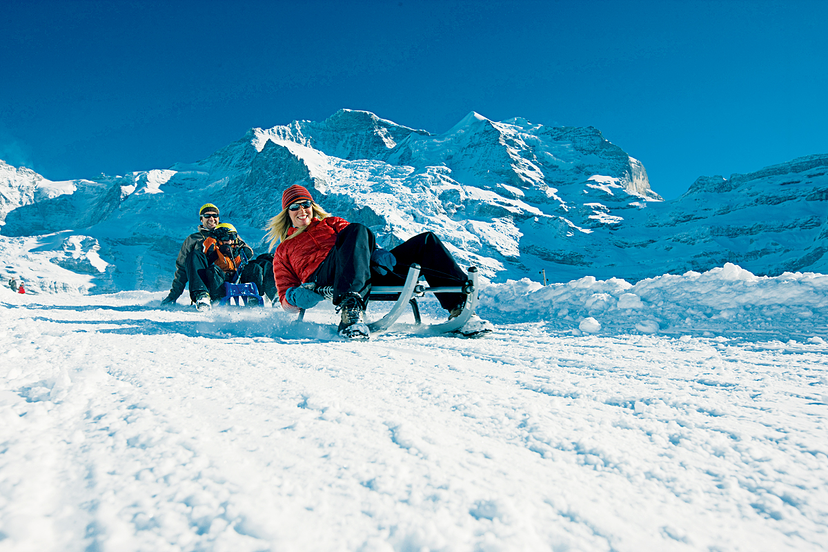 Day Sledding is the perfect way to enjoy fresh snow, mountain terrain, and stunning alpine views. After a 20 minute drive from Interlaken, you will take a small mountain gondola up to a quiet village that directly overlooks the Eiger, Mönch, and Jungfrau. Your experienced guides will lead the way as you zoom down our 1-hour sled run through snowy forests, past frozen waterfalls, and pause for panoramic views of snow-capped peaks. Sledding is pure fun for both kids and adults and is a must-do winter activity.
