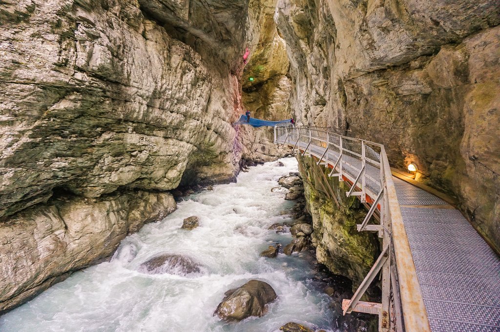 An impressive masterpiece of nature, the Glacier Canyon was formed by the lower Grindelwald glacier, which over time carved its way through the rock in this area. Sadly the lower glacier no longer exists, but the canyon itself is now thriving as a popular destination for a unique sensory walk through its exposed rock galleries and tunnels. The rushing water cascades freely from the mountains into the Lütschine River below, sometimes causing a sudden rush of wind through the canyon and a rapid temperature flux as rays of light reflect along the steep walls.